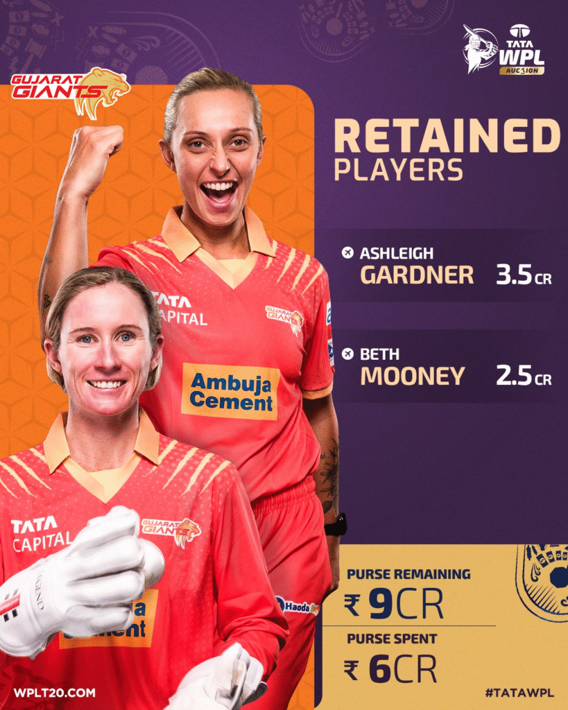 The Gujarat Giants have retained two international heavyweights: Ashleigh Gardner and Beth Mooney.